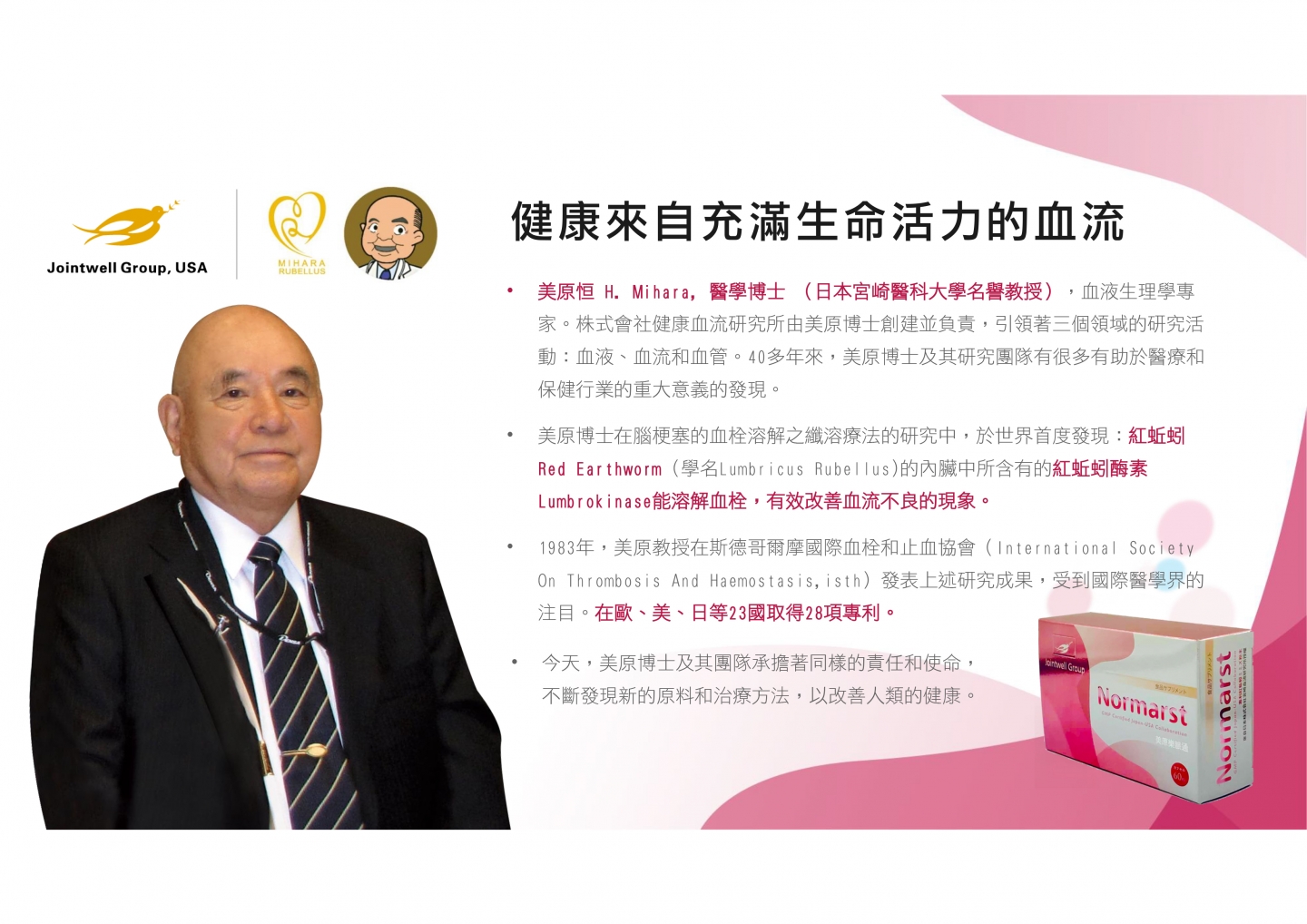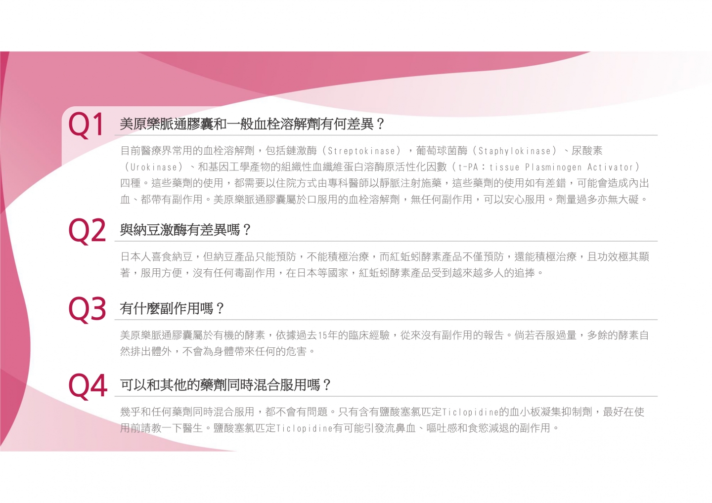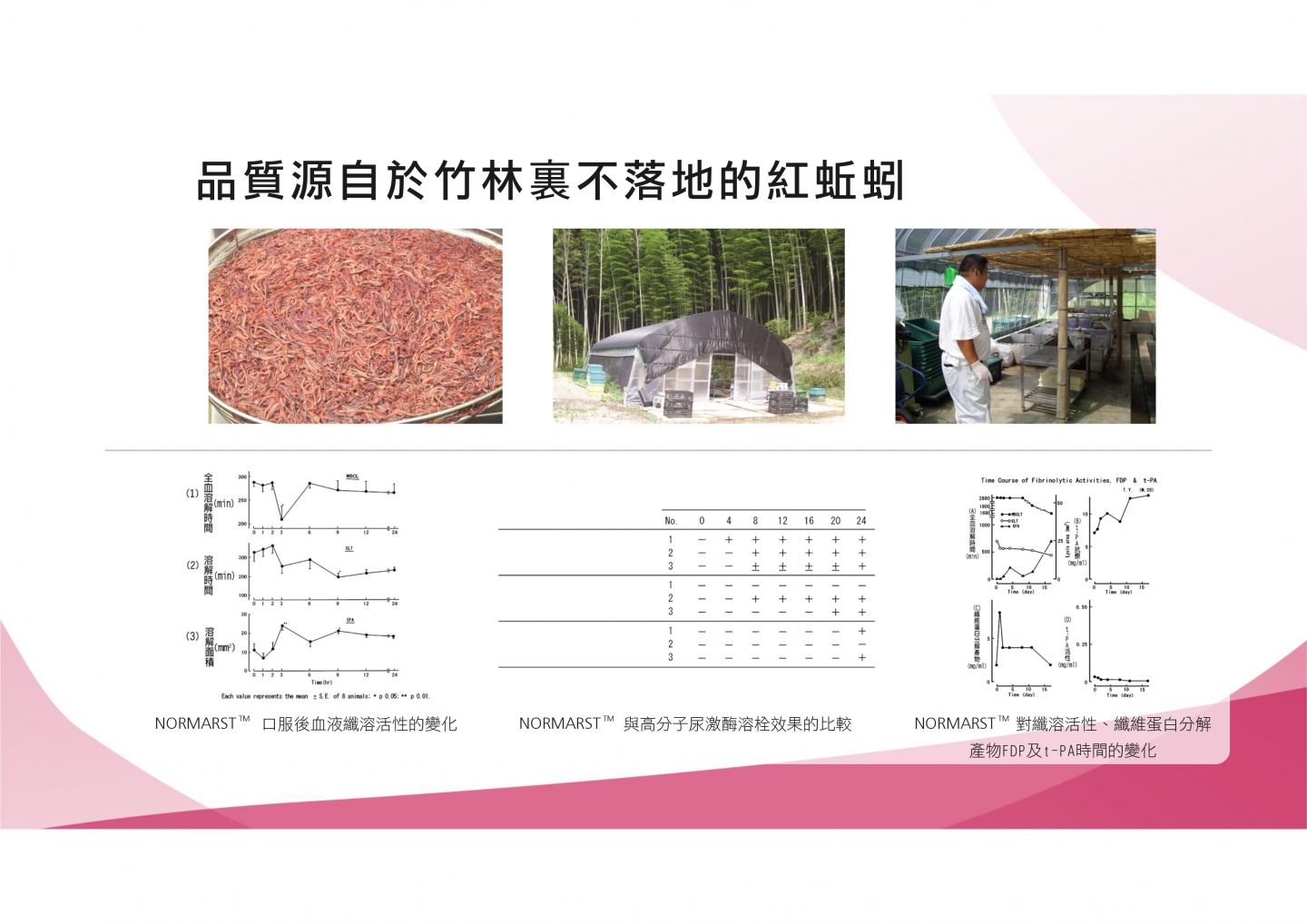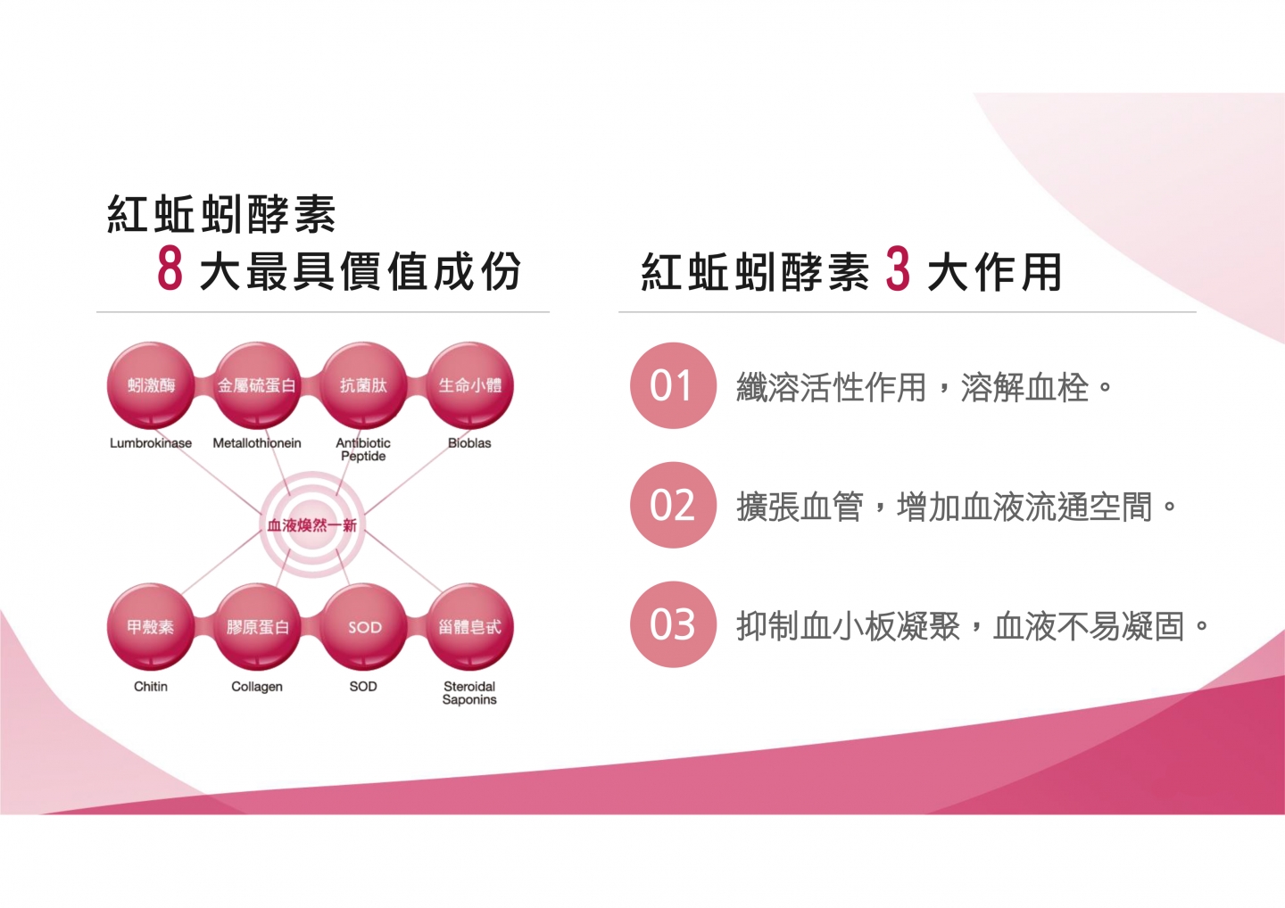 特色:本產品所添加之主要成分為美原恆博士於1983年從日本「露天紅赤子愛勝蚓」中首度發現並萃取出之有效成分「蚓激酶」。